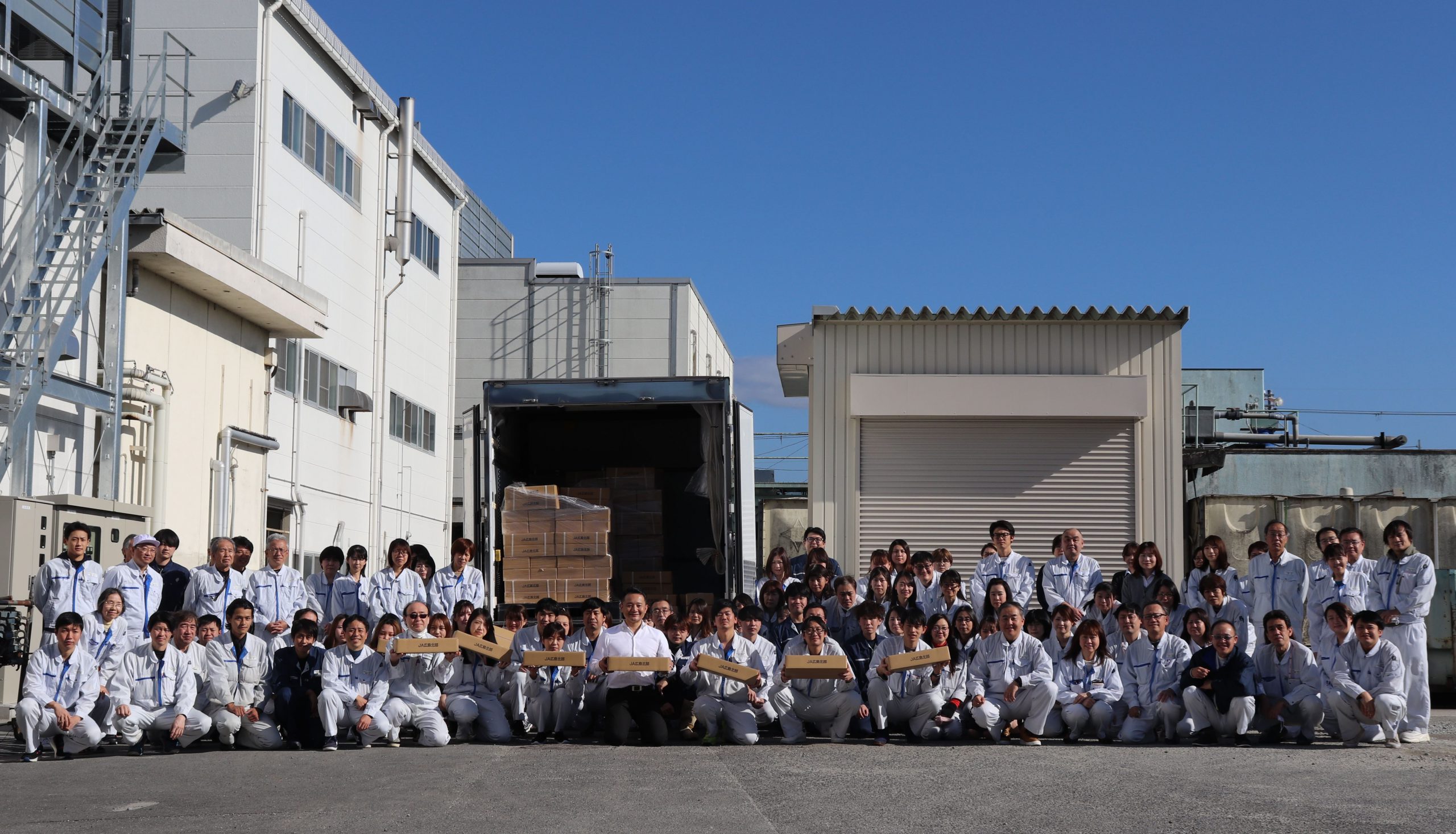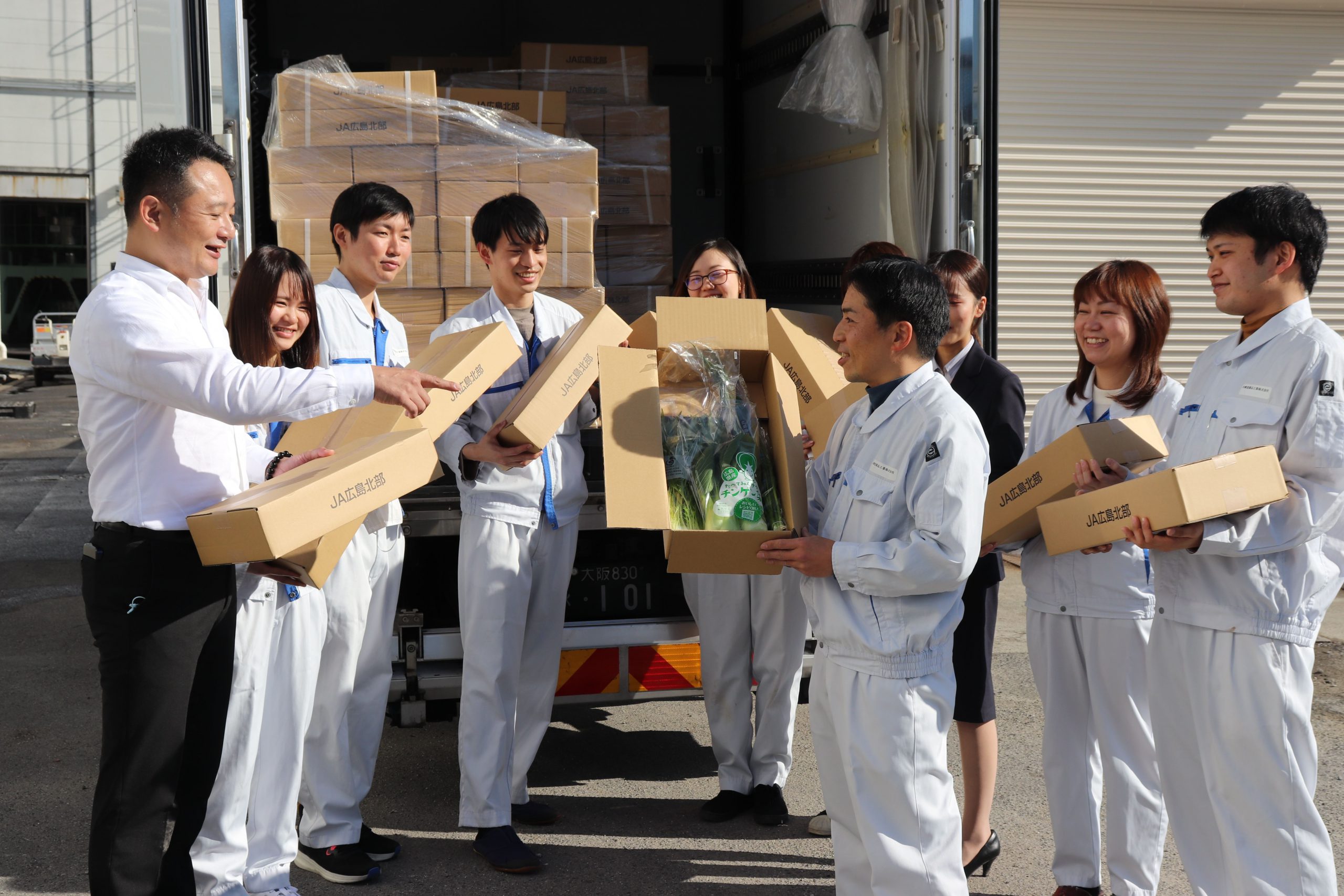 web対談研修を行った生産地より、青梗菜を含めた広島県産のお野菜を全従業員分購入させて頂き、到着時にセレモニーを行いました。