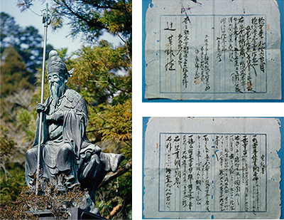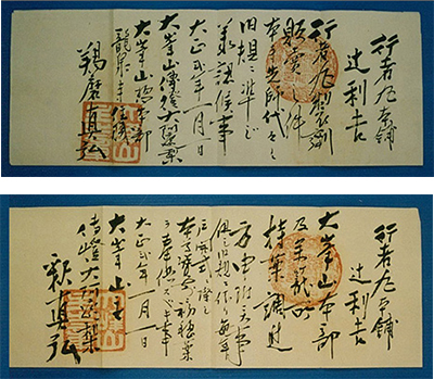大峰山・龍泉寺から「行者丸」の製造・販売許可を傳授(でんじゅ)された際の書。利吉は創業以前、すでに製造・販売許可を取得していた。この書には、「行者丸」という薬を製造し、これに役行者の像をつけて販売してもよい、という内容が書かれている。- 1900